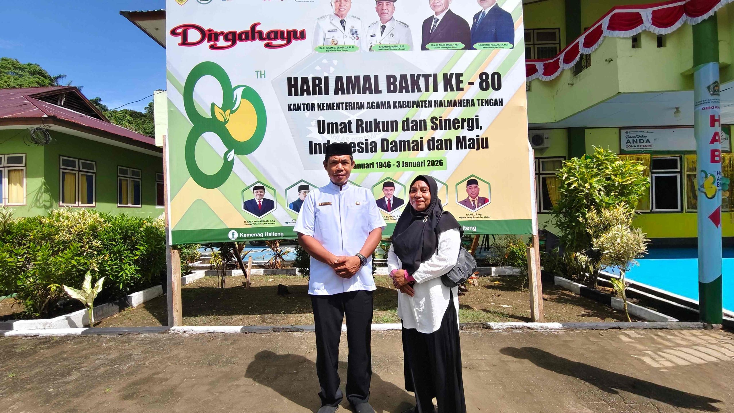 Weda – Ketua Persatuan Guru Republik Indonesia (PGRI) Kabupaten Halmahera Tengah, Sahril Tahir, bersama istri menghadiri upacara peringatan Hari Amal Bakti (HAB) ke-80 Kementerian Agama Republik Indonesia yang dilaksanakan oleh Kantor Kementerian Agama Kabupaten Halmahera Tengah, pada Sabtu, 3 Januari 2026.
