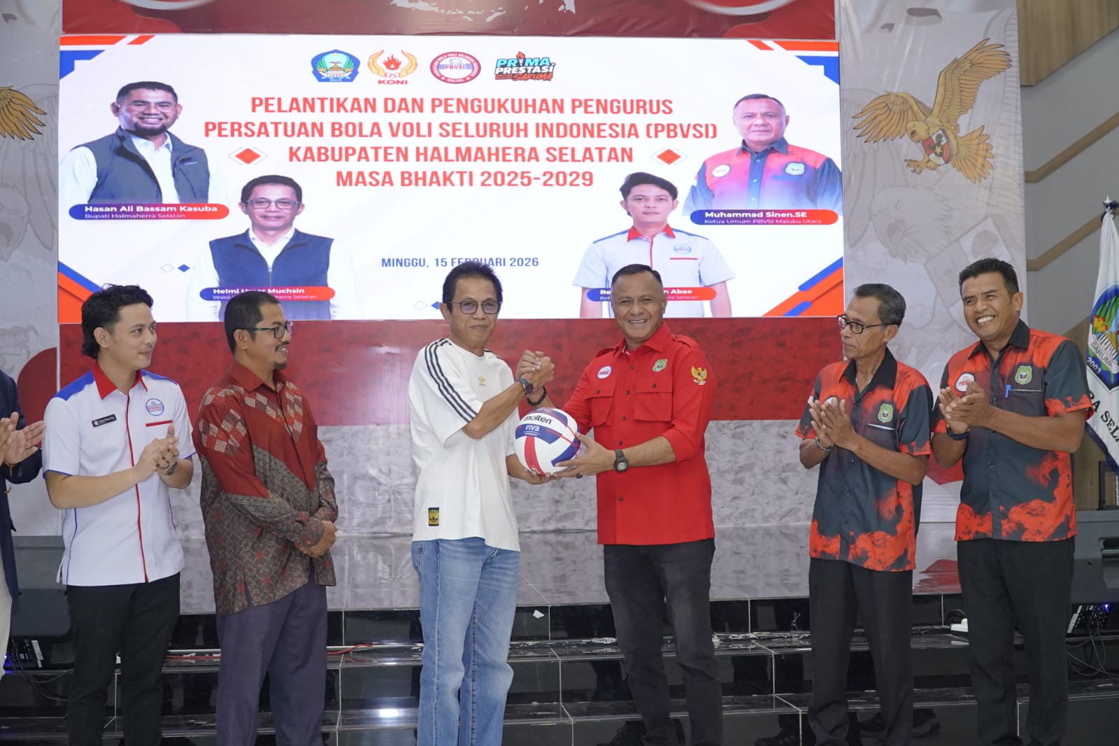Gonone.id – Wali Kota Tidore Kepulauan Muhammad Sinen selaku Ketua Umum Persatuan Bola Voli Seluruh Indonesia (PBVSI) Provinsi Maluku Utara menghadiri sekaligus memberikan sambutan pada Acara Pelantikan Pengurus PBVSI Kabupaten Halmahera Selatan di Aula Kantor Bupati Halsel, Minggu (15/2/2026) Siang.