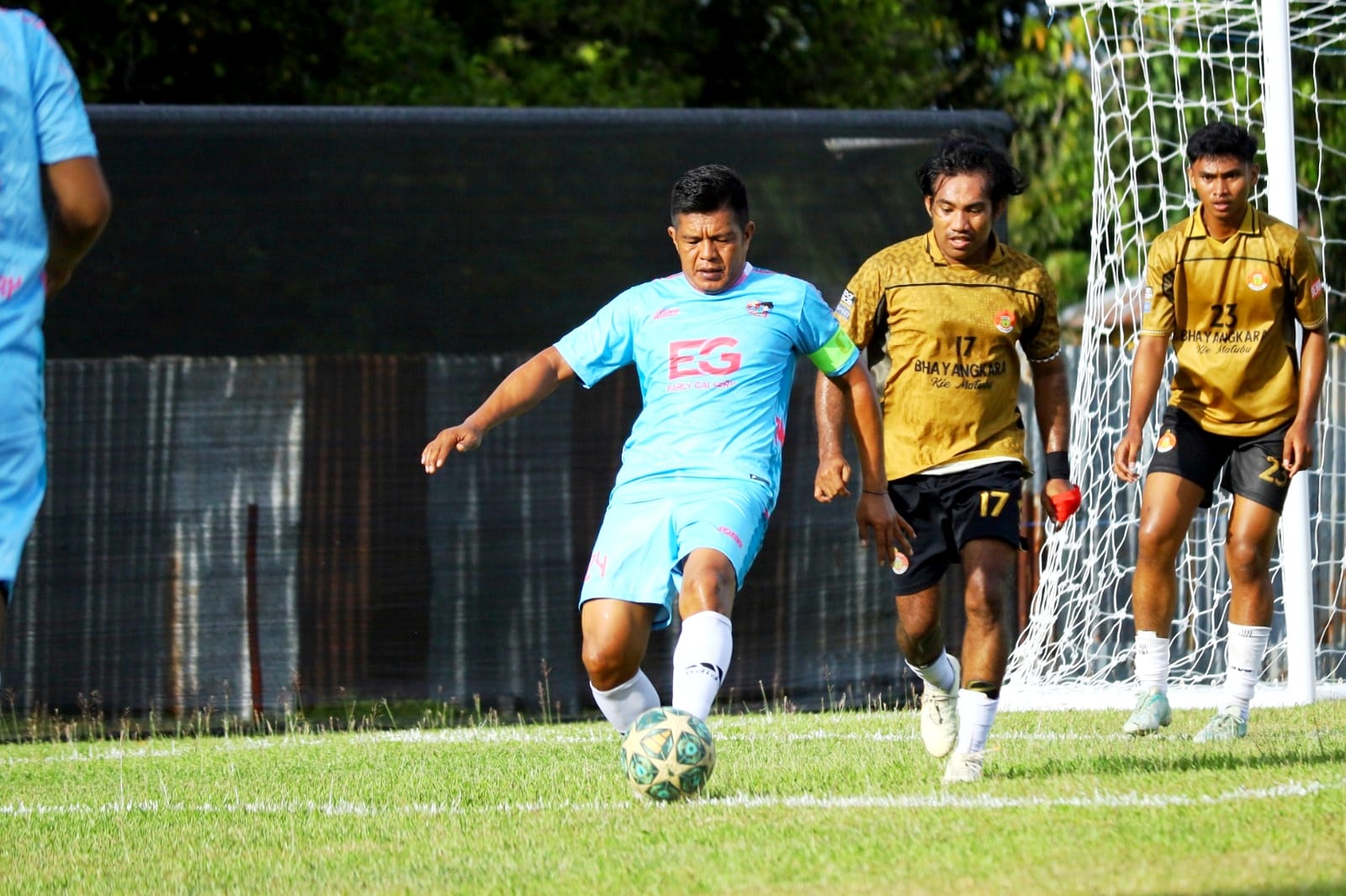 Upaya mengejar ketertinggalan terlihat dari permainan umpan pendek MBG FC. Aziz (6) sempat menjadi motor serangan, namun lini belakang Early Galleri tetap solid, menutup setiap celah yang ada.