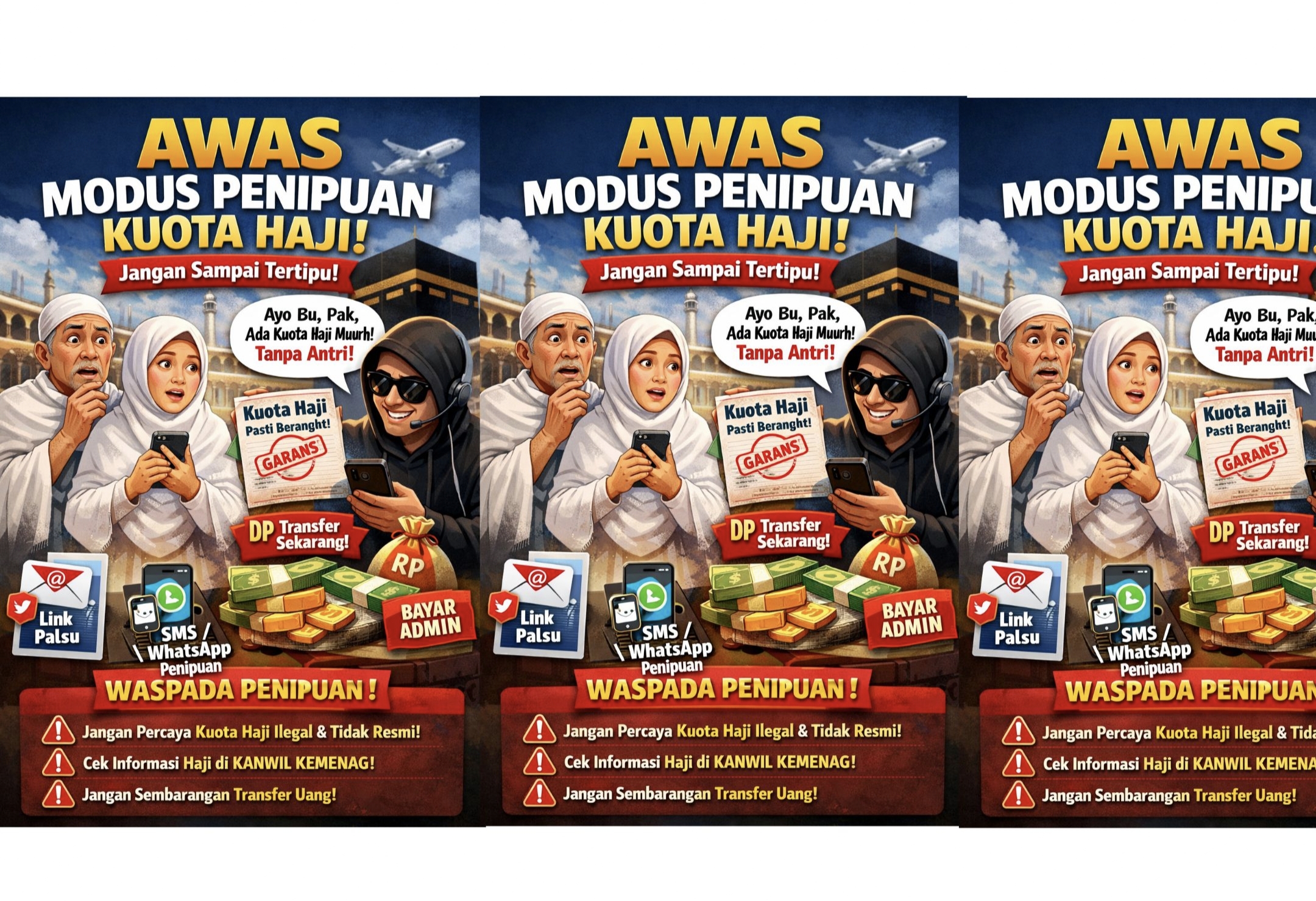 “Saat ini telah ditemukan modus penipuan baru, di mana pelaku menghubungi calon jamaah haji melalui telepon dari nomor yang tidak dikenal, dengan mengatasnamakan Kantor Kementerian Agama maupun Kantor Kementerian Haji dan Umrah. Pelaku menyampaikan adanya penambahan kuota haji dan menawarkan percepatan keberangkatan,” jelasnya.