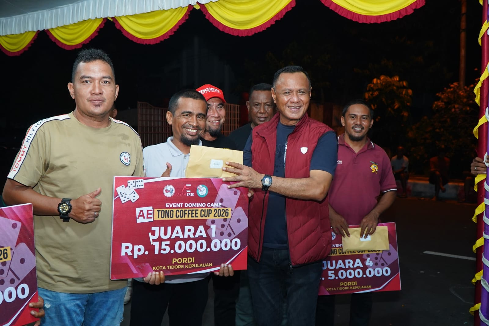 Gonone. id— Riuh tepuk tangan, gelak tawa, hingga perdebatan kecil yang khas di meja permainan menjadi penutup yang tak terlupakan pada Event Domino Game AE Tong Coffee Cup 2026. Tiga malam berturut-turut, ruang depan Tong Coffee di Kelurahan Tuguwaji berubah menjadi arena adu strategi dan kesabaran, sebelum akhirnya resmi ditutup pada Minggu (26/4/2026) malam.